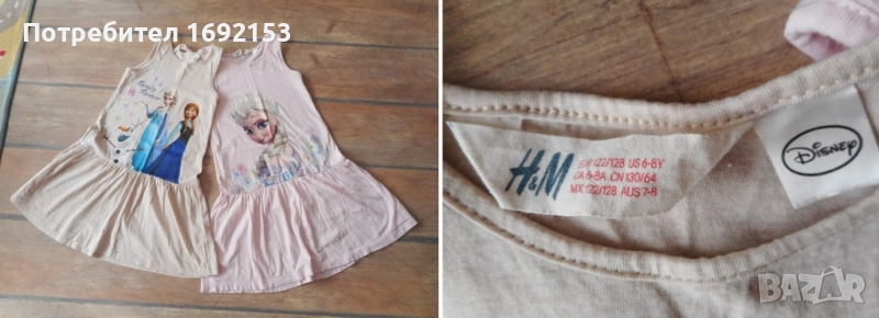 - Комплект 2бр рокли H&M с принт от филма "Замръзналото кралство" за 6-8 год, 122-128см. Цветовете са бледо-бежово и бледо-розово. Дължина на бежавата рокля с Ана и Елза – 70см. Дължина на розовата рокля с Ана – 72см. Материята е 100% памук. На ханша са с набор и волан в долната част. Без подплата. Роклите са в идеално състояние. Цена на 2-те заедно като нови - 25лв.