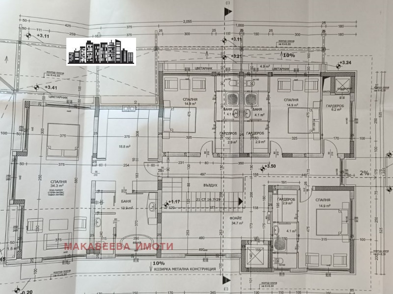 Продава къща с РЗП 710кв. и двор 3 200кв.м, във високата част на с.Белащица, на асфалтов път, в двора има две сонди, ток на имотна граница. Къщата е със следното разпределение: сутеренен етаж с площ от 276кв.м, в които са предвидени гаражи, фитнес зала, котелно, три избени помещения и перално помещение, на първо ниво с площ от 209кв.м: дневна, столова, кухня, спалня с прилежаща към нея баня с тоалетна, килер и тераса 80кв.м, на второ ниво с площ от 225кв.м: четири спални към всяка спалня има прилежащи гардеробно помещение и баня с тоалетна. Височина на таваните 3,50м, в къщата е предвидено по проект да има асансьор от сутерена до втория етаж на къщата и платформа и шахта за прането. По проект в парцела са предвидени 5бр паркоместа. Къщата е с плосък покрив изпълнен с висококачествена изолация с възможност за поставяне на фотоволтаици, дограма Рейнърс. Къщата е с акт 14. Изключителен имот заповядайте да ви го покажем, агенцията е с ключ за имота.