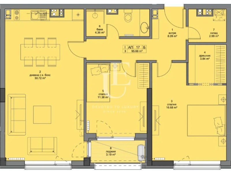 Апартамента е с площ от 114кв.м и е със следното разпределение - коридор, баня с тоалетна, всекидневна с кухня, родителска спалня със самостоятелен дрешник, втора спалня, южна тераса и мокро помешение. Цената е без включен ДДС. Ref. ID:22665