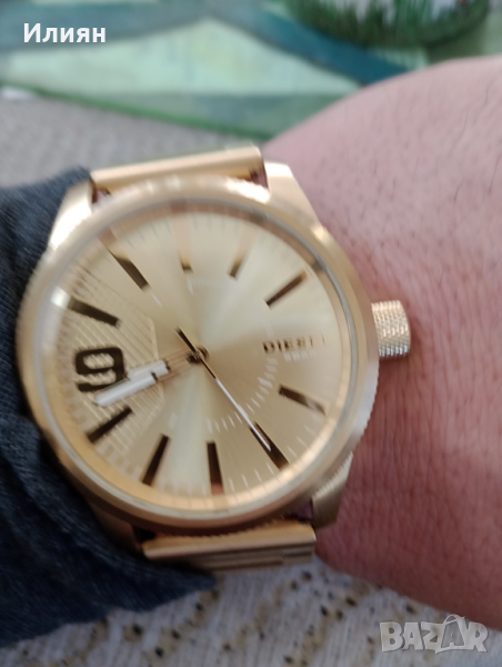 Мъжки часовник DIESEL GOLD много запазен,с кутия,книжка с инструкции, каса 46мм водоустойчив до 5 бара ,(50 м) стоманена каишка със златно покритие... неразличим от нов!!!японски механизъм!