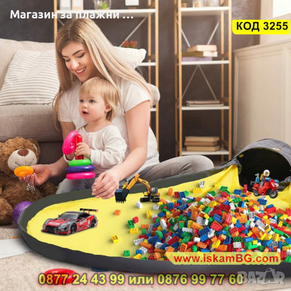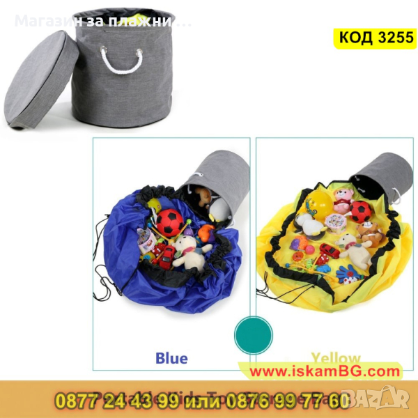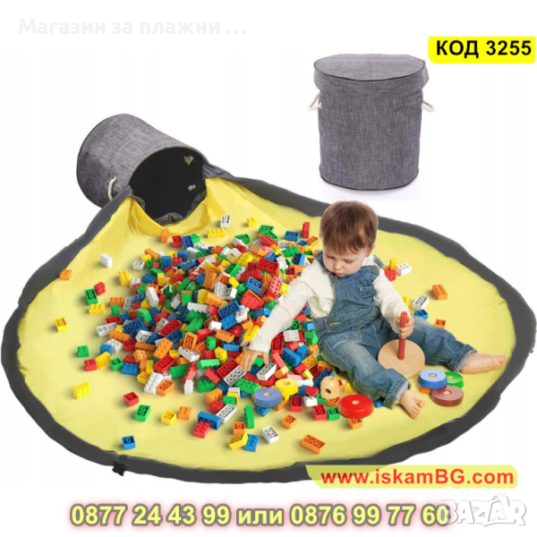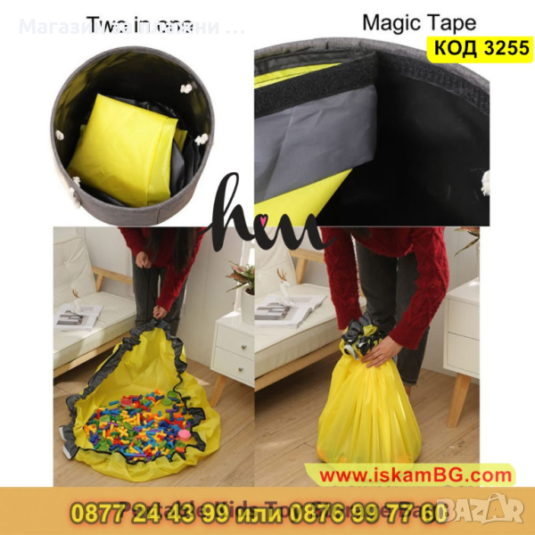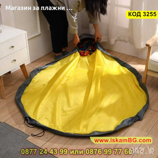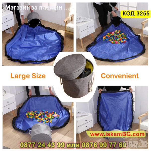 Омръзнало ли ви е да повтаряте постоянно на детето "Прибери си играчките!"? Ако да, това е решнието за вас! Тази голяма и удобна чанта прибира и съхранява хилядите дребни и не толкова дребни детски играчки. Когато се разтвори, чантата служи за подложка за игра, а след това само с едно дръпване на шнура, чантата се затваря и всички играчки остават в коша за играчки.