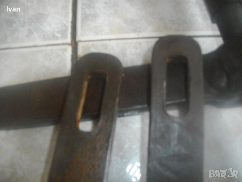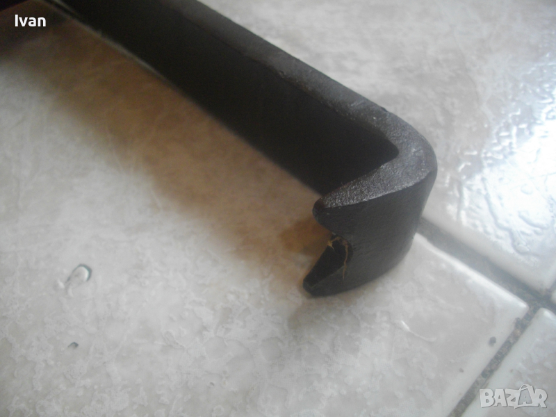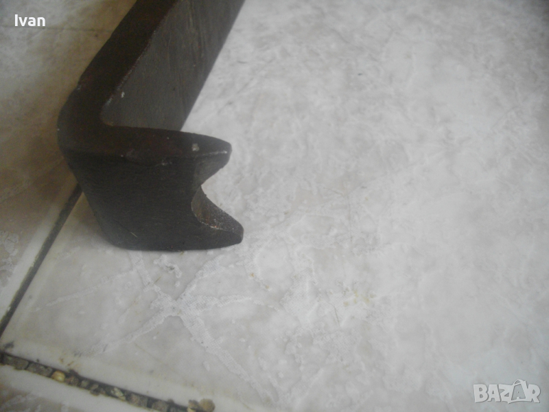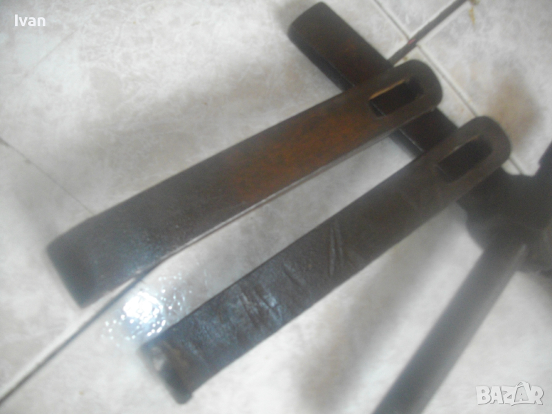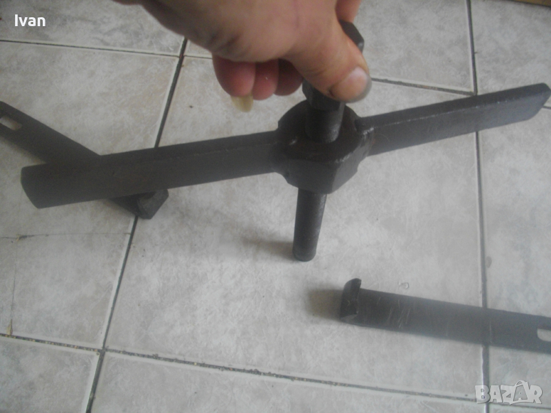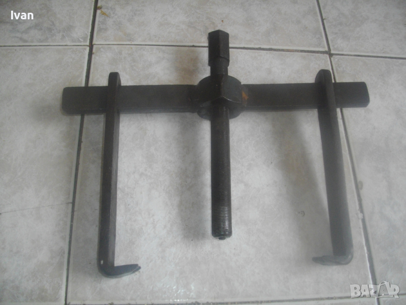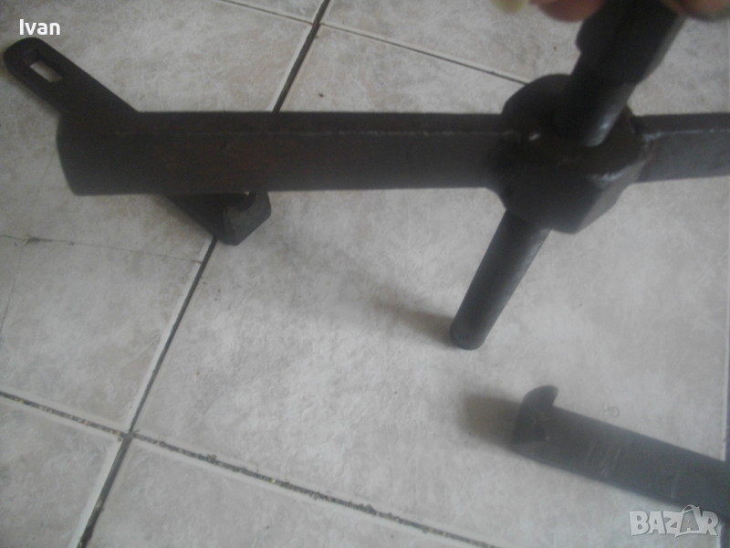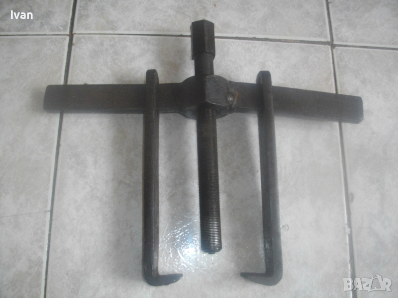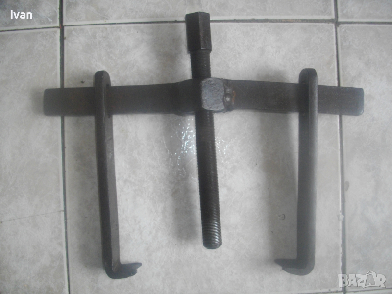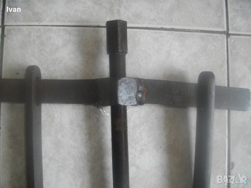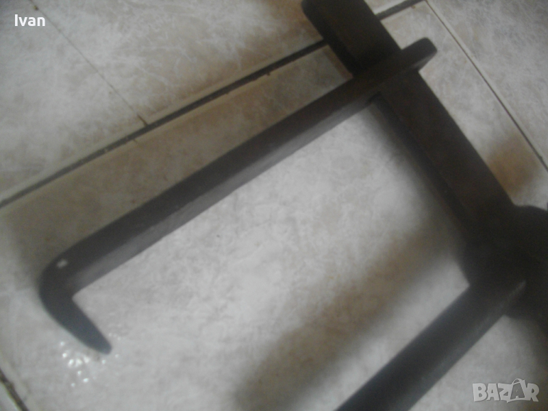 ОПИСАНИЕ на голяма скоба за вадене на лагери. Цена 179 лв. Масивна, правена ръчно от дебело масивно желязо. Не е фабрична. Размер на захват на лагери от 65 мм до 310 мм лагери. Захватните щипки раменана скобата са ръчно ковани.Винтова стяга с дължина 240 мм и глава шестостен 25 мм. Рамена дължина 210мм, от дебело желязо 10 мм ширина. Запазен външен вид на скобата и отлично работно състояние. Лека забележка отгоре от едната страна при въртока - лека заварка, което не пречи на работата. Тегло на скобата - 2,8 кг. Цена на скобата - 179 лв.