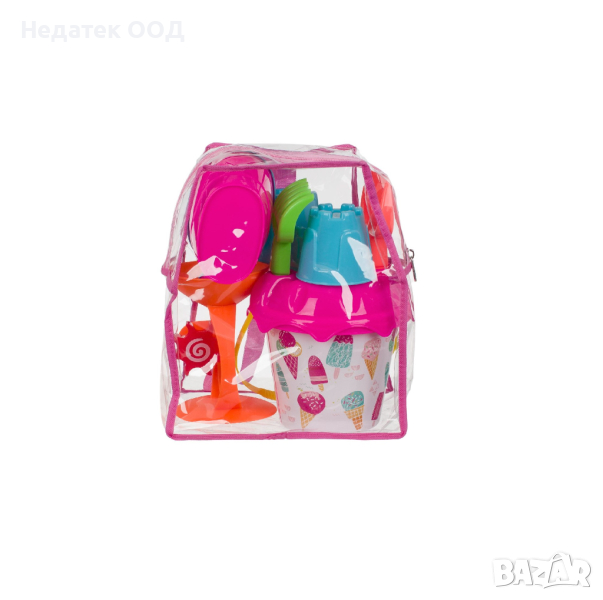 Плажна кофа (16x18 см) бяло/фуксия с шарка на сладолед и 5 аксесоара, включително лейка, мелница, гребло, лопата и форма за пясъчен замък, вътре в практична прозрачна раница.