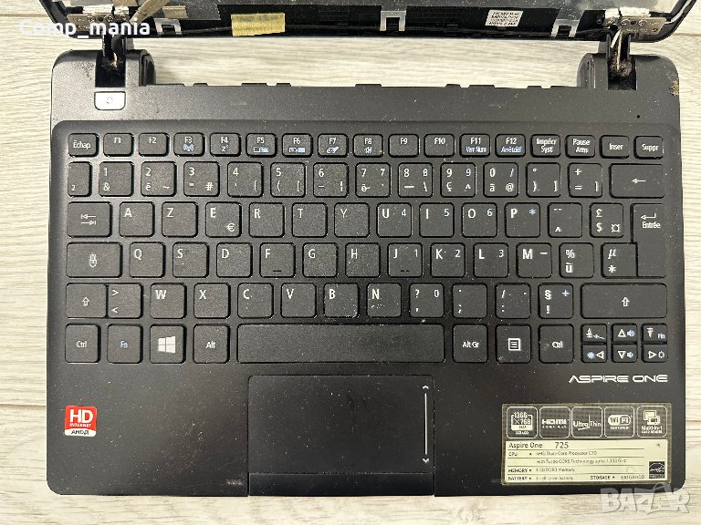 Продавам лаптоп за части ACER ASPiRE One 725 цената е за целия лаптоп както си е на снимките, корпуси здрави, панти здрави, говорители здрави, клавиатурата и тъча работят, дъното е с проблем но е вътре в
