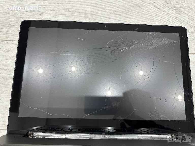 Лаптопа е работеща, но дисплея е счупен и няма хард и цената е съобразена с това, корпуса е здрав, клавиатурата и тъча работещи, батерията също така държи заряд.