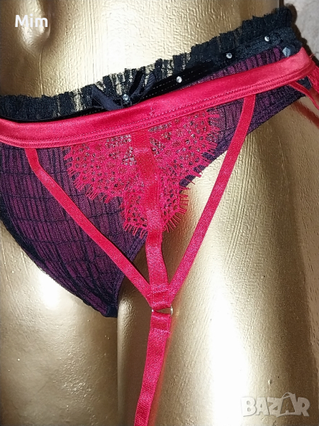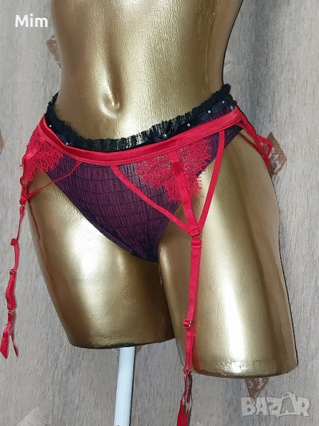 Червен дантелен колан с жартиери за чорапи, в талията със сатенен колан, закопчаването е отзад едноредовос телени закопчалки,талия 70 до 85 см еластичност. неразличим от нов без хартиен носител