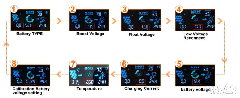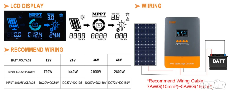 ●【12V/24V/36V/48V ПОДДРЪЖКА НА БАТЕРИЯ】 контролерът е съвместим с различни батерии (оловно-киселинни и литиеви, потребителски персонализирани); Запечатани, гел, наводнени и LI (Lifepo4) параметри за зареждане на батерията са предварително зададени, други батерии могат да бъдат персонализирани според вашите нужди.