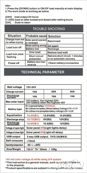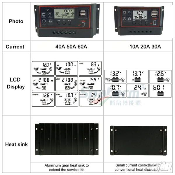 Този контролер е интелигентен, многофункционален за зареждане и разреждане. В този продукт се използва фиксиран LCD дисплей с много приятелски интерфейс; различни контролни параметри могат да бъдат гъвкаво зададени(по желание може ръчно задаване на минималния и максималния волтаж на батерията) , напълно отговарящи на вашите различни изисквания за приложение.