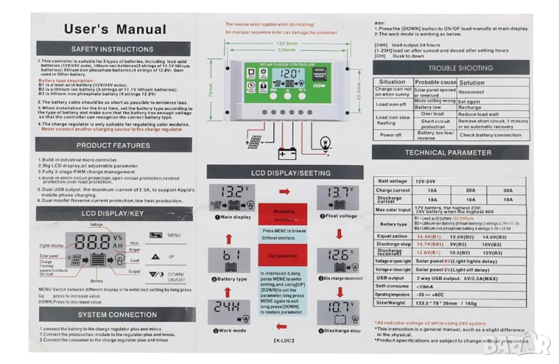 Този контролер е интелигентен, многофункционален за зареждане и разреждане. В този продукт се използва фиксиран LCD дисплей с много приятелски интерфейс; различни контролни параметри могат да бъдат гъвкаво зададени(по желание може ръчно задаване на минималния и максималния волтаж на батерията) , напълно отговарящи на вашите различни изисквания за приложение.