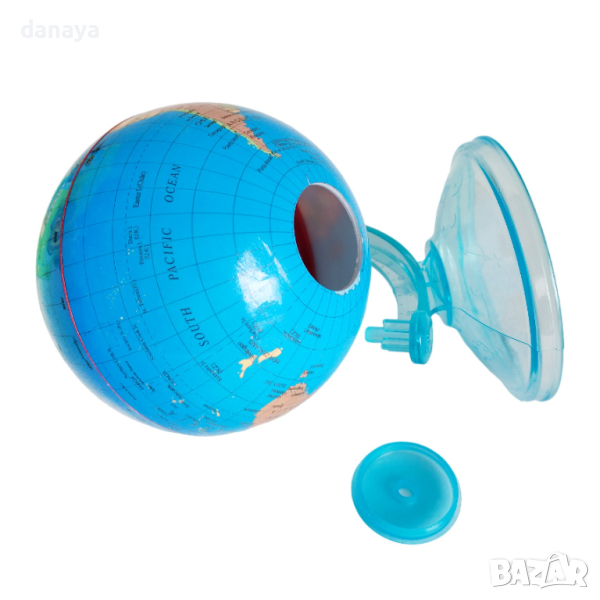 Малък политически глобус касичка за монети, функционално допълнение към бюрото на начинаещият изследовател, прекрачил скоро училищният праг. Спестовността трябва да се поощрява винаги дори и под формата на земно кълбо. Здрава и качествена изработка. Стойка от полупрозрачна синя пластмаса.