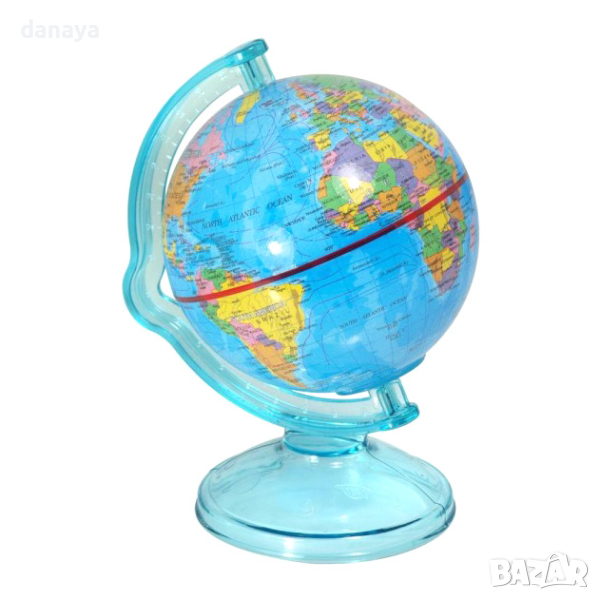 Глобус с политическа карта на света и с диаметър 10.5 cm. Красив аксесоар с компактни размери за всяко бюро и добър помощник по география на всеки ученик.