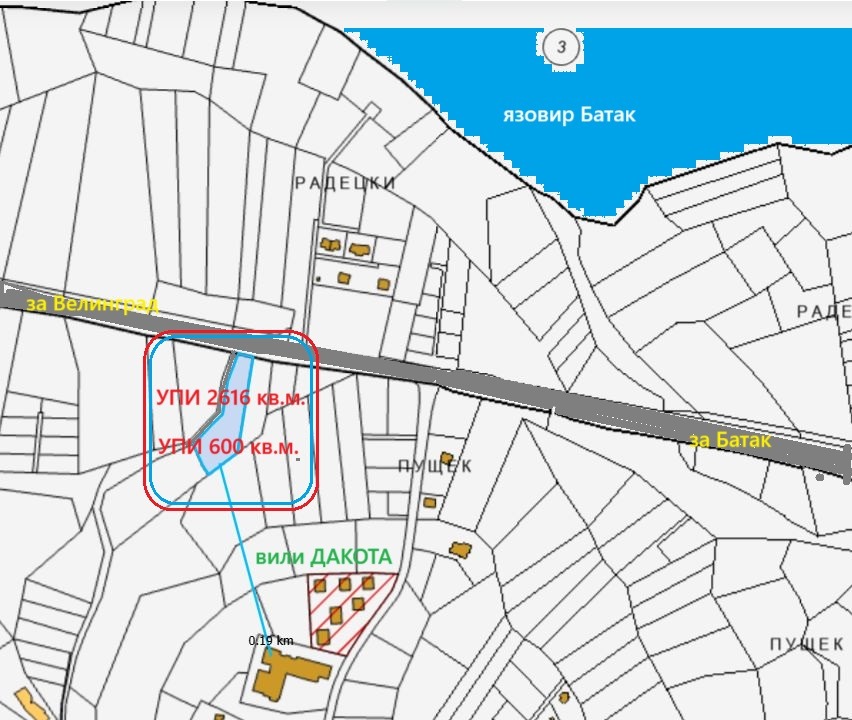 Реф. 480142;'Тонико имоти' предлага срещу ОБЕЗЩЕТЕНИЕ УПИ 2616 кв.м. с ПУП, готови проекти за фамилни редови къщи/вили и разрешение за строеж. РЗП на редовите къщи варира от 86 кв.м. до 147 кв.м. Имотът е ъглов, с лице 14 м на главния път и 100 м на второстепенен асфалтов път. Намира се на 200 метра от брега на язовир Батак. За контакт: Антоанета Ненова 0898 613 555