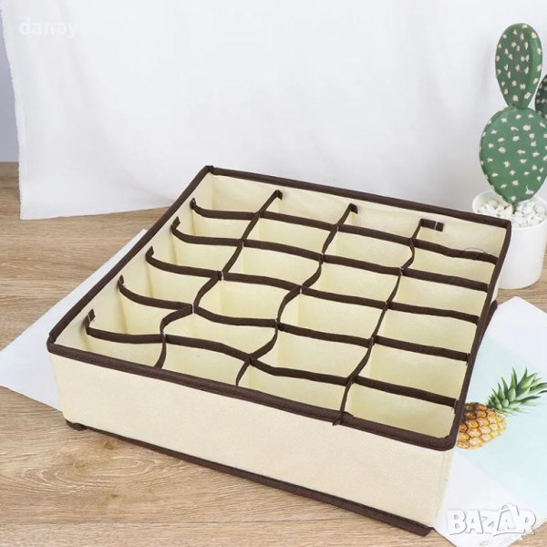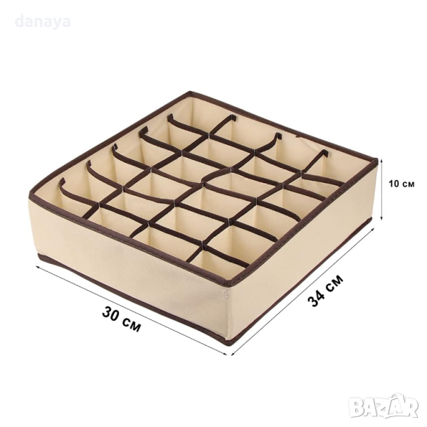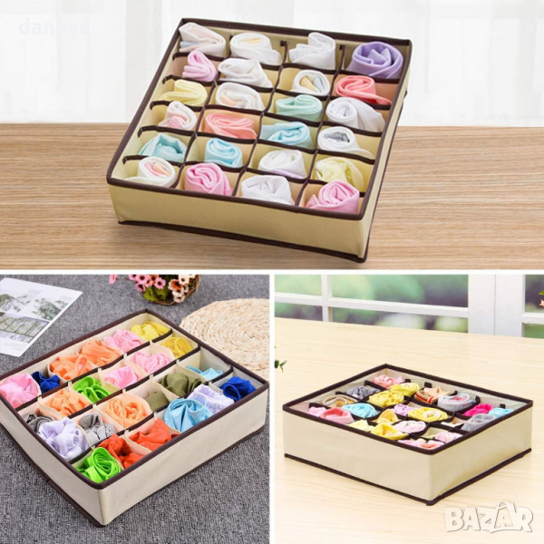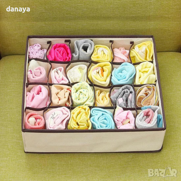 Сгъваема кутия за съхранение на чорапи, бельо, шалове и други дребни аксесоари. Текстилен органайзер за гардероб, чекмедже, шкаф, органайзер за под леглото. Органайзерът е сгъваем и лесно преносим, което го прави подходящ и за пътуване. 24 отделения.