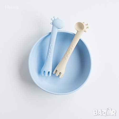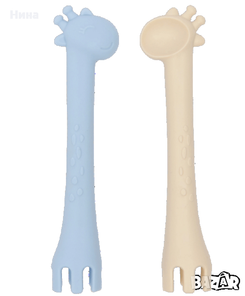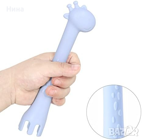 Проектирани за лесна употреба и практичност. Забавната форма на жираф има лъжица от едната страна и вилица от другата, и осигурява допълнителен лесен захват в средата за малките ръчички на детето. Гъвкави и меки, те са идеални за венците на бебето и може да се използва и като продукт за зъби.