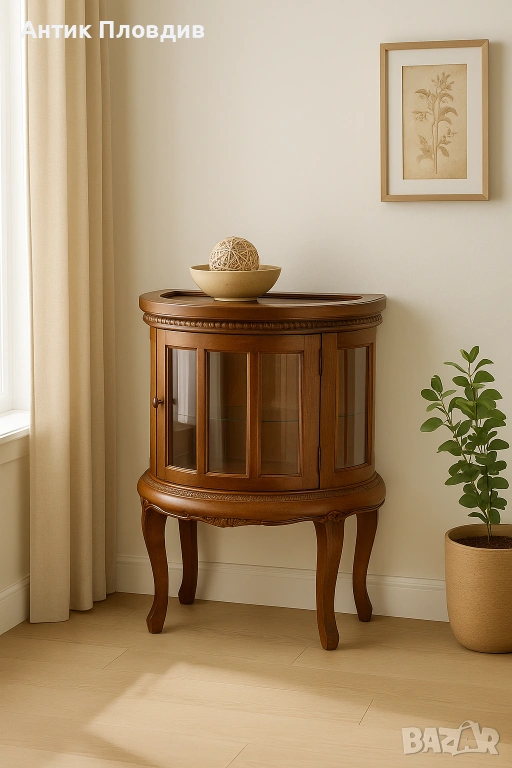 Полукръглата форма на шкафа му придава уникален и изящен вид и позволява да бъде долепен до стена. Този нестандартен дизайн създава интересен фокус във вашия интериор и се отличава със своята оригиналност. Извитите крачета на шкафа допълват конструкцията му, придават лекота и изграждат невероятен стил.