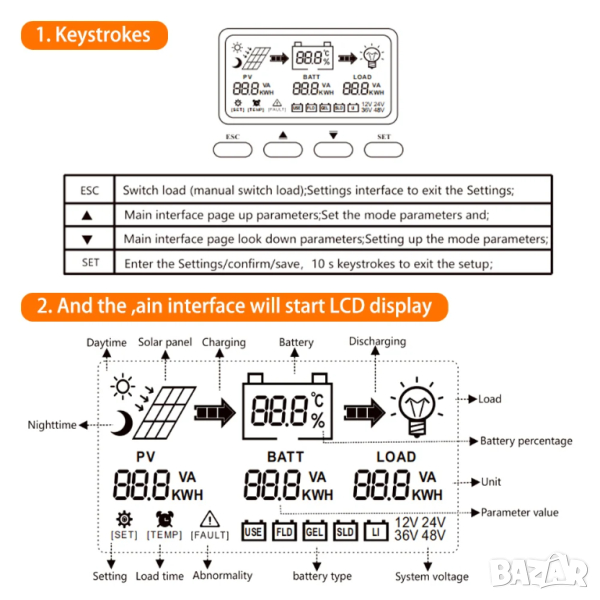 -Зарежда следните видове батерии - оловни , гелови и LiFePo4 волтаж на батерията: 12V/24V Auto
