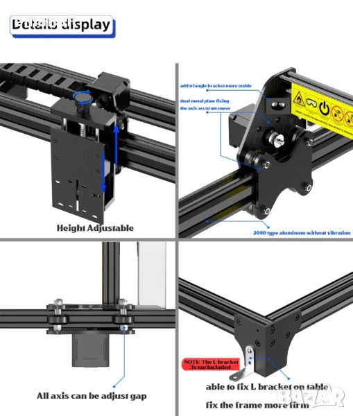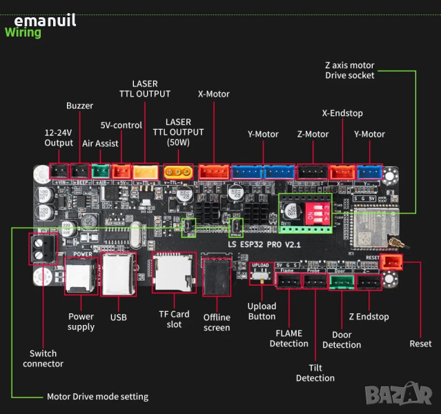 Контролери които могат управляват до 50W лазерен модул,автоматично управление на компресор Air assist през LightBurn,могат да управляват CNC рутер - Лазерна машина със смяна на Firmware,могат да работят с драйвери които се монтират на контролера или с външни драйвери за по-мощни стъпкови мотори NEMA.