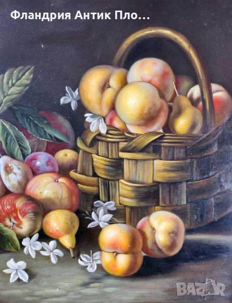 Кошницата е поставена върху плот, който също е увенчан с есенни плодове и малки разпръснати цветчета. Красивите оттенъци на златисто, червено и оранжево, които преливат върху платното, засилват чувството за уют и спокойствие.