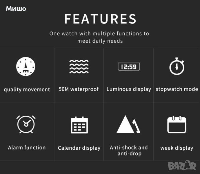 - За ваша информация, както, можете да видите на една от снимките часовника в един сайт (Amazon) струва 21,99$ които са 40лв без няколко стотинки, но аз го продавам за 37лв нов разбира се.