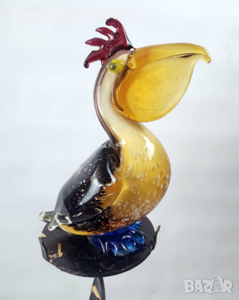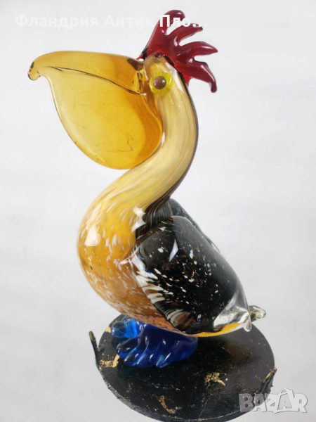 Стъклото, използвано за създаването на пеликана, придава на скулптурата прозрачност ефирност. Този материал може да бъде оцветен в различни нюанси и оттенъци, за да се създаде желаният визуален ефект. В случая са използвани цветове като жълто и кафяво.