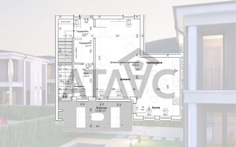- Етаж 1: Дневна, кухня и трапезария, баня с wc, веранда, гардеробна.