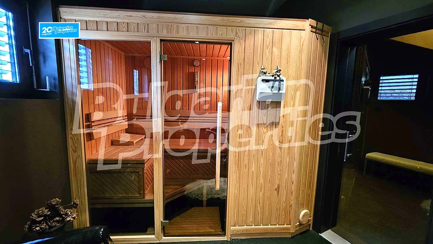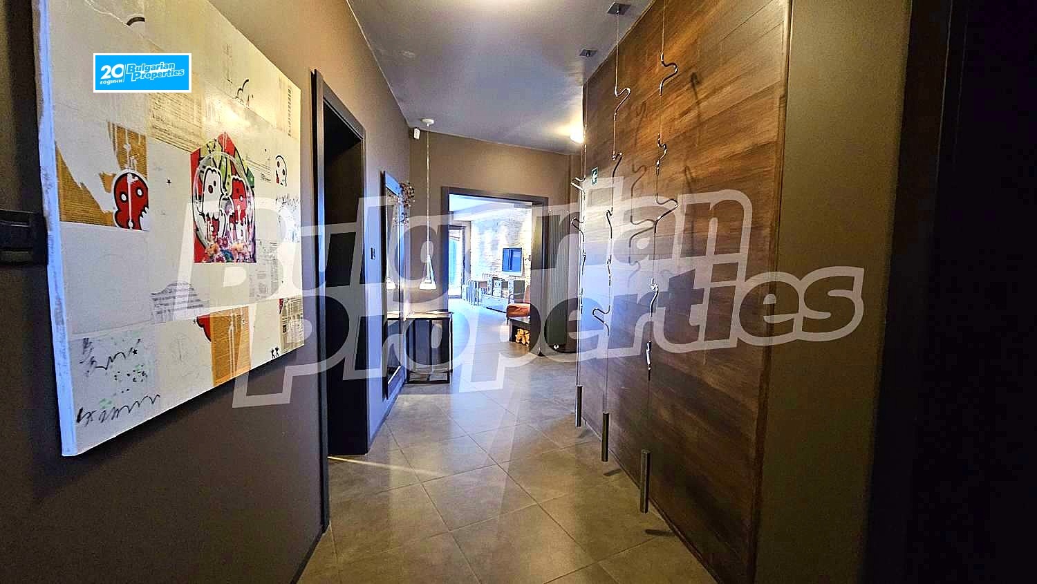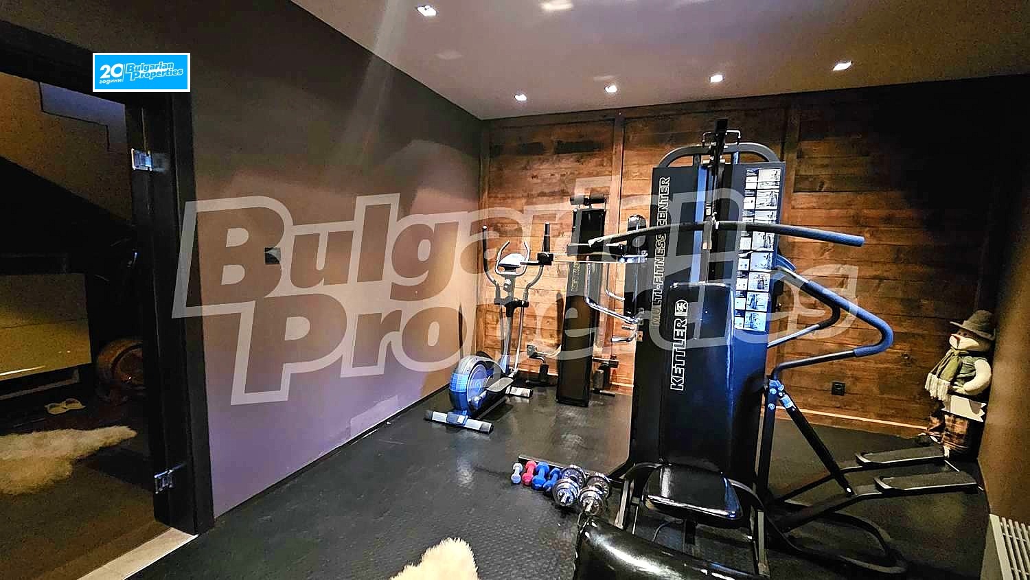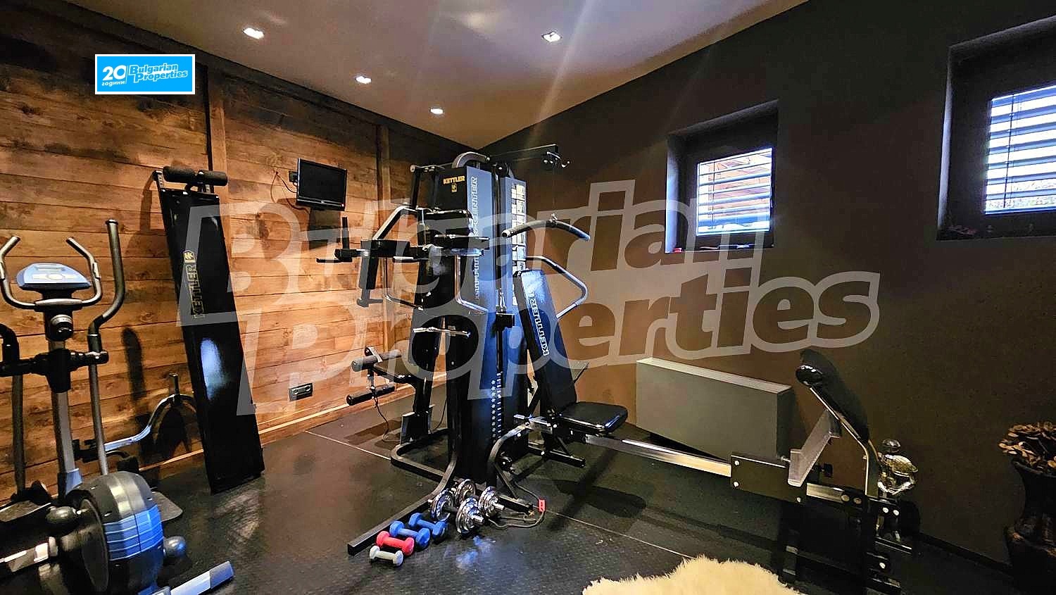 Първи етаж: коридор, кухненски бокс, просторна всекидневна с камина, WC, веранда, фитнес и сауна, гараж
