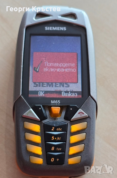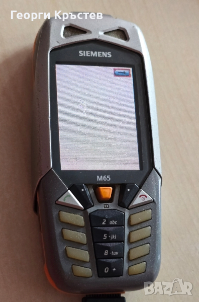 M65 - телефона има може би софтуерен проблем, не може да се включи, само в началото започва, и после забива, зарежда си батерията, но зарядното трябва да се намести, добър външен вид, няма го капачето за камерата и държача за капака, корпуса е пукнат, има БГ меню, без батерия и зарядно.