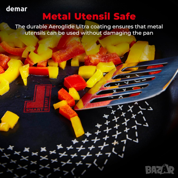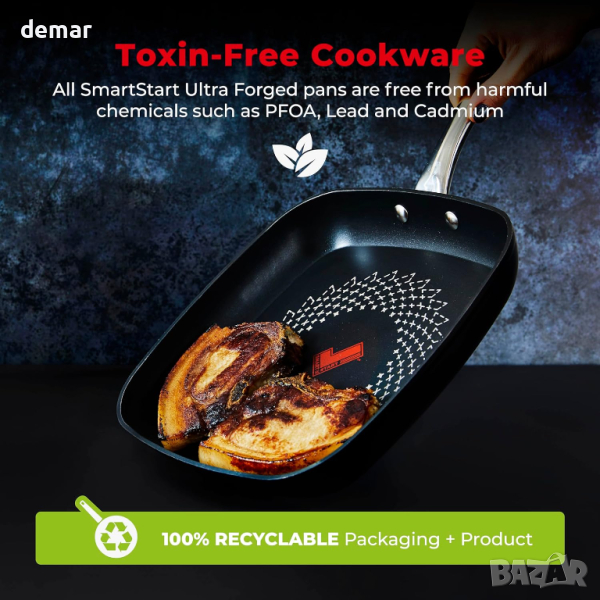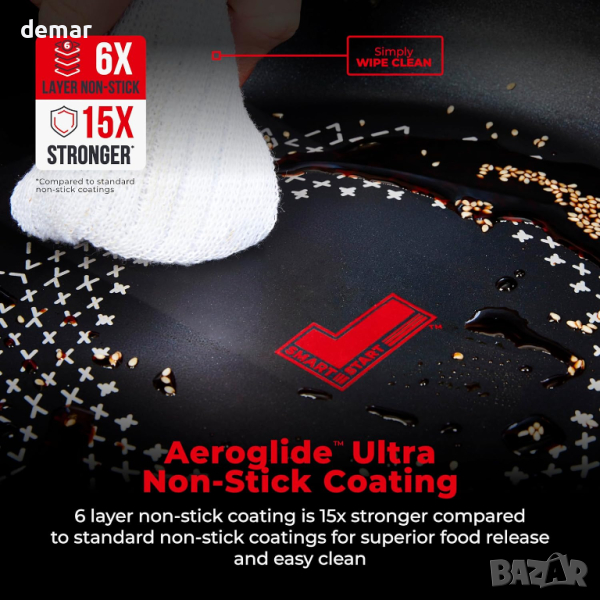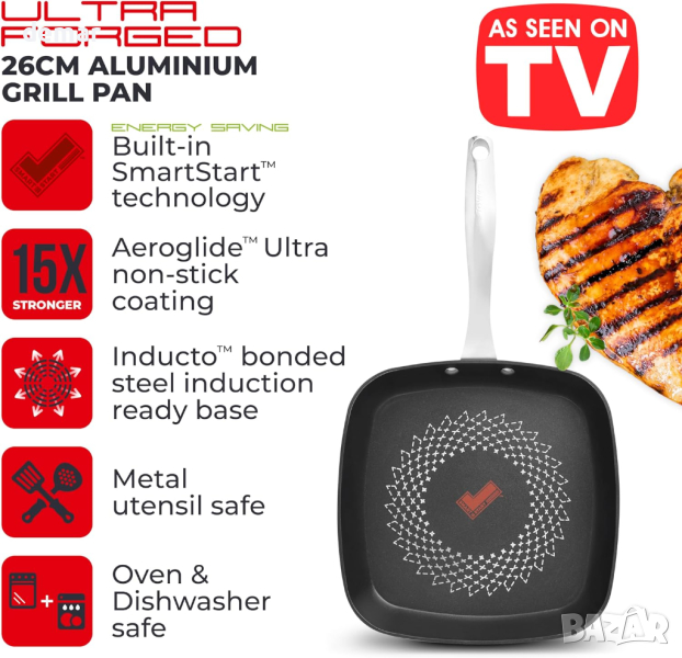 Този 26 см грил тиган предлага достатъчно място за семейни ястия, което го прави идеален за приготвяне на сочни пържоли и ароматни вегетариански бургери. Отличаващ се с технологията SmartStart, температурен сензор в незалепващото покритие променя цвета си, за да покаже кога тиганът е достигнал оптималната температура за готвене, осигурявайки перфектни резултати всеки път. Тиганът разполага с незалепващо покритие AeroGlide Ultra, ексклузивно за гамата SmartStart Ultra Forged, предлагащо превъзходно освобождаване на храната и лесно почистване със своето 6-слойно покритие, което е 15 пъти по-издръжливо от стандартните незалепващи повърхности. Изработен от кован алуминий с дебелина 4,5 mm, той е лек, но изключително здрав, с отлична топлопроводимост за бързо нагряване и лесна работа. Не съдържа PFOA, олово и кадмий, този грил тиган с първокласно качество комбинира безопасност с производителност.