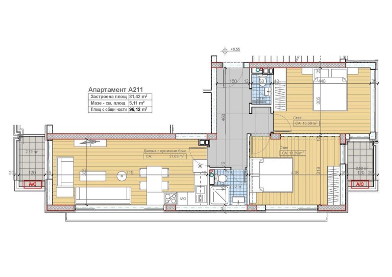Тристаен апартамент А211 изложение: дневна юг, стая1 частично-запад, основно - север, стая2 изток, на отлична локация в м.Гърдова глава (част от кв.Бояна) на ул.'Преки път' 84 в луксозна жилищна сграда с изцяло окачена вентилируема фасада и дограма от композитен материал GENEO на REHAU с троен стъклопакет, четворна хидроизолация на покрив и покривни тераси. Етап: довършителни работи