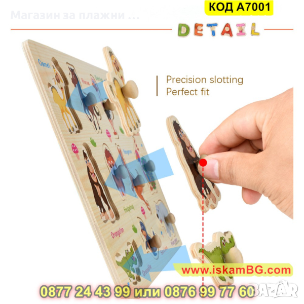 Дървен пъзел Дино с дръжки и размери 30х22,5 см. - модел A7001 - КОД A7001 → Обява 44997199