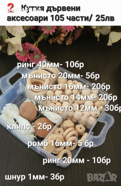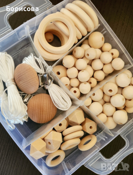 Кутия със 105 части дървени аксесоари за бебешки клипс → Обява 45002357