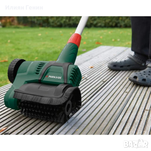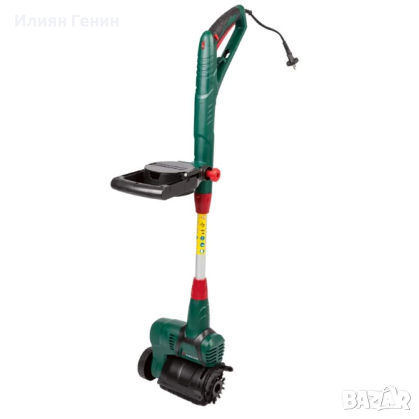 Комбиниран инструмент 2 в 1 за почистване на повърхности и пукнатини Премахва мъх, мръсотия и утайки от вътрешни дворове, пътеки или алеи Подходящ за естествен камък, бетонни настилки, плочки, дърво или дърво-пластмасови композитни материали (WPC) - в зависимост от използваната четка - уверете се, моля, вижте инструкциите в инструкциите за експлоатация Мощна 500 W електрическа четка с 3 приставки: 1 цилиндрична четка със здрави пластмасови влакна 1 слот четка с мощни телени влакна 1 слот четка с нежни найлонови влакна Регулируема скорост на въртене Телескопична водеща дръжка за адаптиране към височината на тялото - плавно регулируема дължина с приблизително 20 см Ергономична основна дръжка с мека повърхност и интегрирано освобождаване на напрежението на кабела Въртяща се втора дръжка с 2 отделения за съхранение Регулируем защитен капак Аксесоари: 1 цилиндрична четка (Ø 100 mm), 1 четка с прорези с телени влакна (Ø 110 mm), 1 четка за цепнатини с найлонови влакна (Ø 110 mm), 1 адаптер за четки за цепнатини, 1 шестостенен ключ Резервни четки могат да бъдат поръчани по-късно - за данни за контакт вижте инструкциите за експлоатация Материал Пластмаса, алуминий, найлон Технически данни Мощност: 500 W Обороти на празен ход: 600 – 1,200/мин. Работна ширина (цилиндрична четка): около 15,5 см Размери около 28,5 x 100 – 129 см Тегло около 4 кг. Консумирана мощност: 500 W Обороти на празен ход: 600 – 1 200/мин. Работна ширина (цилиндрична четка): около 15,5 см.