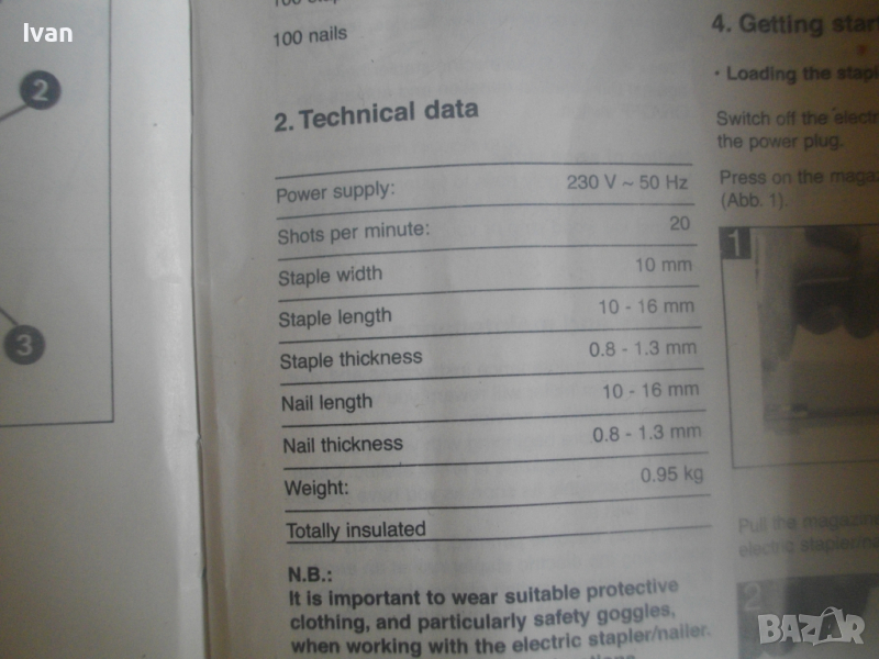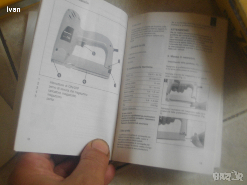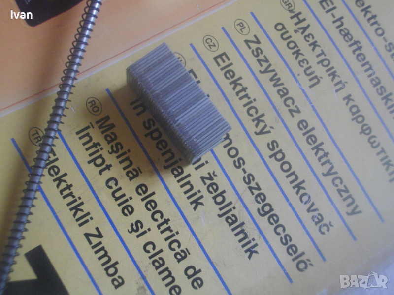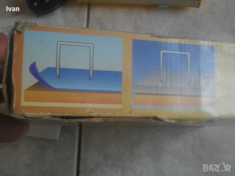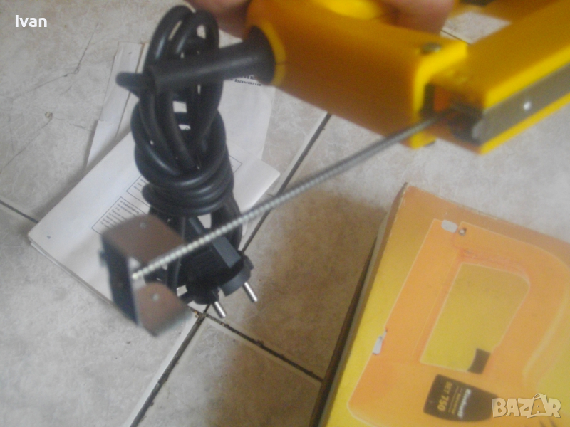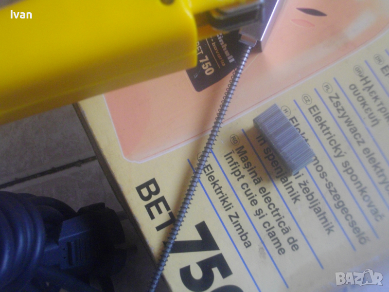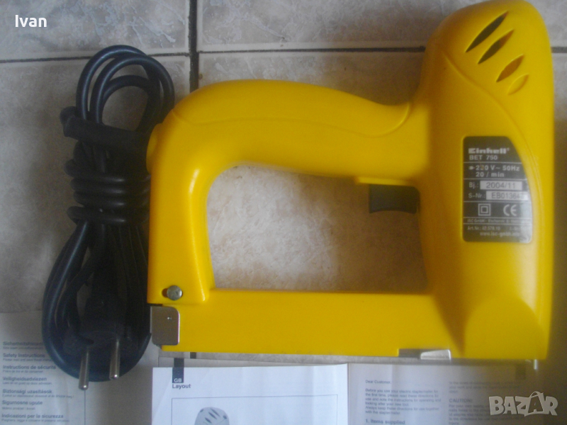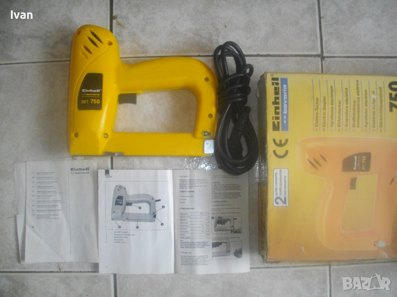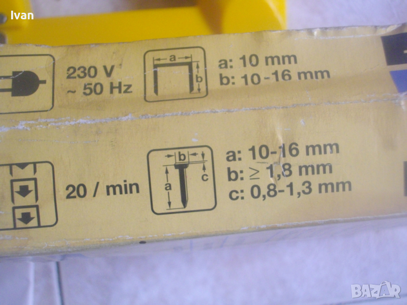 ОПИСАНИЕ на жълт нов електрически такер - цена 119 лв. Нов, неупотребяван електрически такер дърводелбски за скоби-кламери и дърводелски пирони, размери 10-16 мм, немски модел на Ейнхел. Марка и модел на машината - Einhell BET 750. Производство - оригиналнонемско, старото и висококачествено - 2004 г. Машината е в отлично техн. състояние.- Удара е силен и мощен, забива добре докрай аксесоарите. За скоби и пирони размер от 10 до 16 мм. Скорост - 20 удара в минута. Стоманен пълнител със стоманена капачка. Към машината има книжки указания за употреба на небългарски езици.Такера е прибран в оригиналната си немска картонена опаковка. В пълнителя са заредени дузина скоби кламери за проба и тест в офис Еконт. Разполагам с други различни такери.