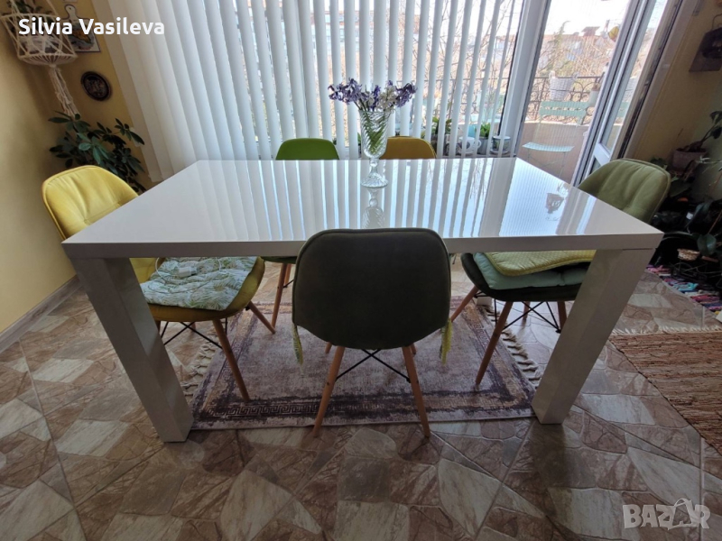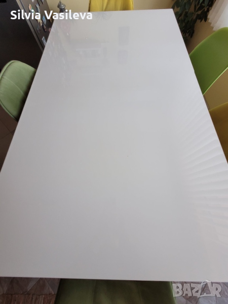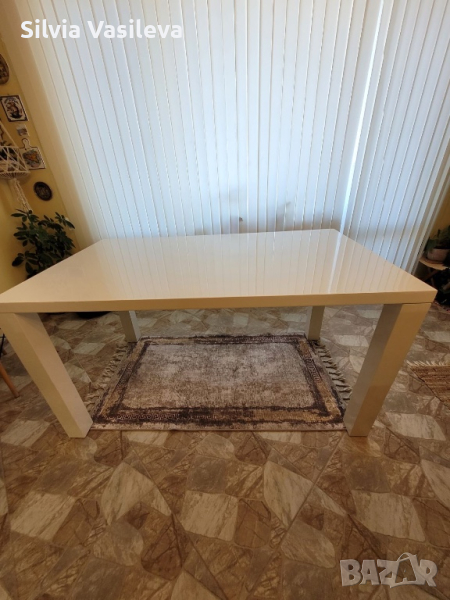 Трапезна маса бял лак. Подходяща за 6 човека. Размер 140/80 . Има забележка точица изгорено от цигара вижда се на снимката.
