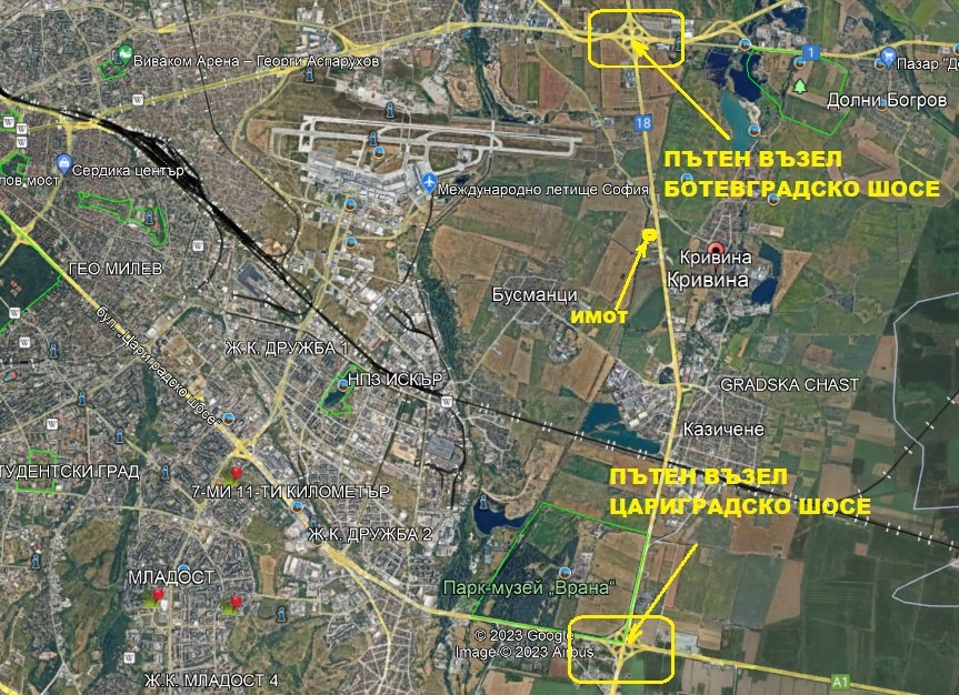 Имота се намира в с. Кривина, община Столична, с 30м. лице на Околовръстен път, в отсечката между бул. Цариградско шосе и бул. Ботевградско шосе, на много комуникативно място, с идентификатор 39791.1437.3. Равен терен с правилна форма, с отличен достъп както от Околовръстното шосе на София, така и от второстепенен път. Района е изключително перспективен, и с много нови сгради наоколо. Попада в смесена многофункционална зона Смф2, с показатели: Плътност: 60%, Кинт: 1,2. Параметрите и предназначението на имота дават големи възможности за развитие. Парцелът е изключително подходящ за построяване на търговска сграда, шоурум, складова база, чисто производство, автосервиз, логистика, зарядни станции за електромобили и хибридни превозни средства, търговия с петрол и др. Към момента е започната процедура за включване в регулация на имота.