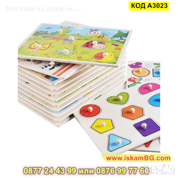 Дървен пъзел Влакче с животни с дръжки и размери 30х22,5 см. - модел A3023 - КОД A3023 → Обява 45009349
