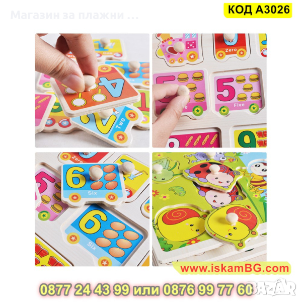 Дървен пъзел 7 животни Сафари с дръжки и размери 30х22,5 см. - модел A3026 - КОД A3026 → Обява 45009427