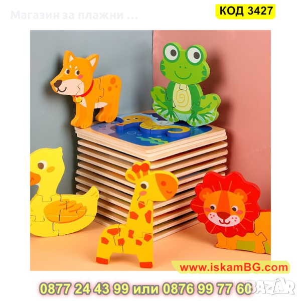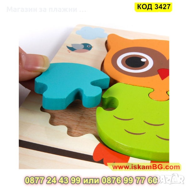 Детски дървен пъзел Хипопотам с 3D изглед и размери 14.5 х 15.4 см. - модел 3427 - КОД 3427