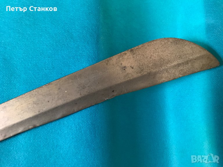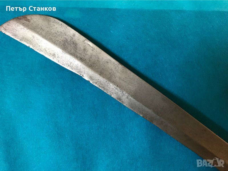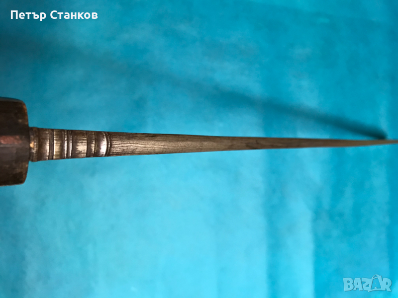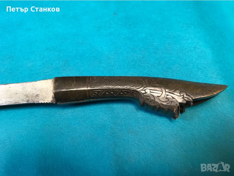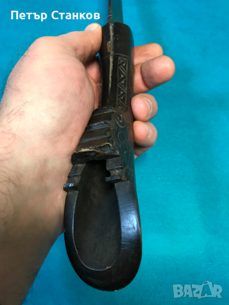 Дамасково острие,рогова дръжка (лека пукнатина).Дължина цялото 72см., острие в най-широката част 4.5см., в основата 10мм. дебело.Остров Суматра около 1900г.