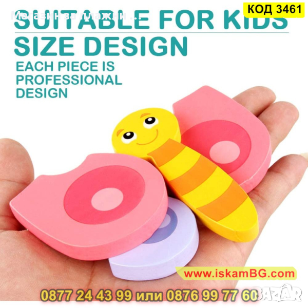 Детски дървен пъзел Пеперуда с 3D изглед и размери 14.5 х 15.4 см. - модел 3461 - КОД 3461 → Обява 45010463