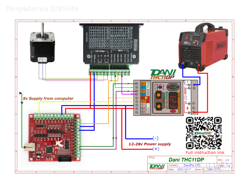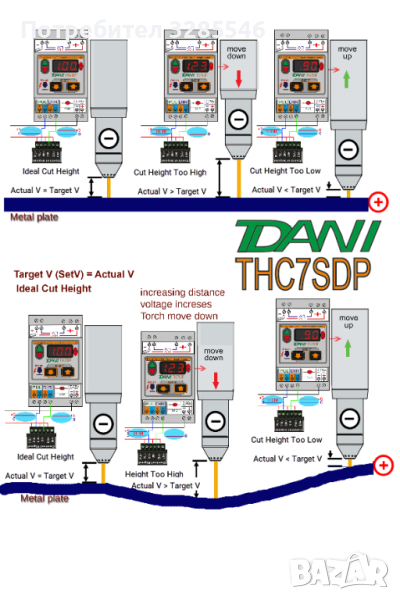 Плазмените машини използват постоянно токово захранване за рязане на стомана. Докато тока на плазмата е постоянен (регулируем от оператора), напрежението се променя, когато разстоянието между върха на горелката и металната плоча се променя. Когато разстоянието между горелката и рязащата плоча се увеличи, напрежението на дъгата се увеличава, а когато горелката се приближи до плочата, напрежението на дъгата ще намалее. Напрежението на горелката може да варира от 10 до 400 волта (или повече), в зависимост от модела на плазмената резачка. Контролерът на височината на горелката (THC) постоянно измерва промените в напрежението и поддържа постоянно разстояние между горелката и рязащата плоча, като изпраща сигнал до двигателя на оста ”Z”, за да се движи нагоре или надолу. Dani THC използва вътрешен делител на напрежението, сглобен от висококачествени компоненти, за да превърне високите напрежения на горелката в четими безопасни стойности и прецизни филтри за защита на процесора от високочестотни смущения, идващи от рязащата горелка. THC изчислява стойностите на измерванията и ги преобразува в контролен сигнал за моторизиран ост ”Z”. Дани THC използва микроконтролер от последно поколение (Atmega328) с настроими 12 параметра, използвайки 2 бутона и 3 светодиода, които съответстват на изходните сигнали (Дъга ВКЛ., Нагоре и Надолу)(Arc on,Up,Down), 3 цифрено 7-сегментно LED дисплей (устойчив на смущения и високи честоти). Dani THC е изграден с най-висококачествени компоненти, за да гарантира безопасна, здрава и надеждна дългосрочна работа.