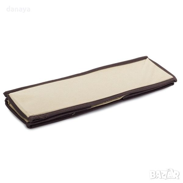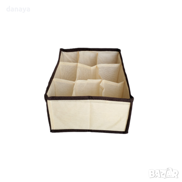 Сгъваем органайзер за чекмеджета с 9 отделения за чорапи, връзки, колани, бельо с размери 30х20х10см. Сгъваем органайзер за гардероб или шкаф с 9 отделения. Сгъваем текстилен органайзер за чорапи, бельо и др. дребни аксесоари, който ще внесе ред по гардеробите и шкафовете. Практичен и удобен, сглобява се лесно и спестява куп място. Ако не го ползвате, просто сгънете и приберете. Изработен от нетъкан текстил за защита от влага и мухъл и същевременно позволява на въздуха да циркулира свободно между дрехите.