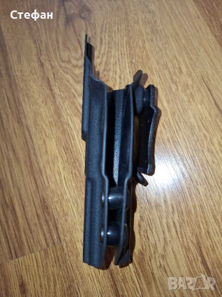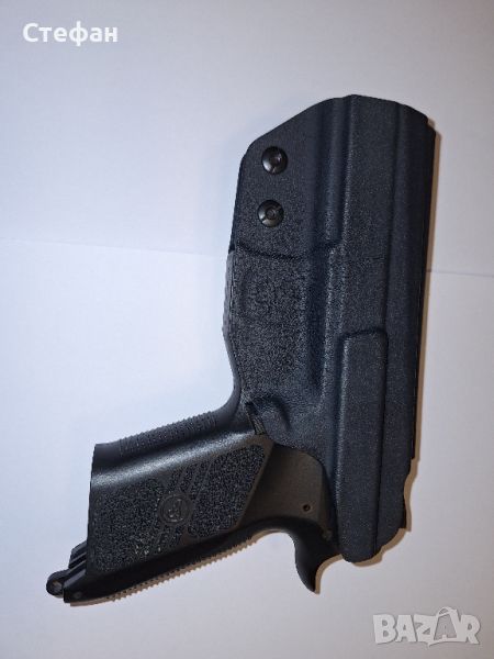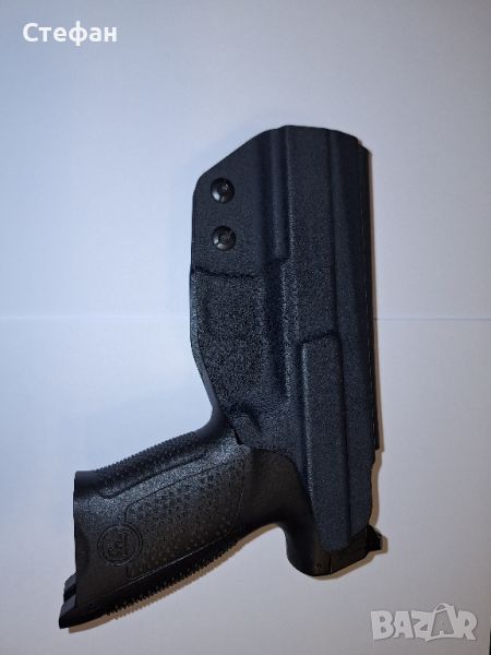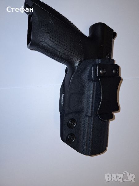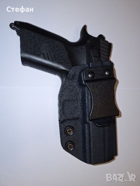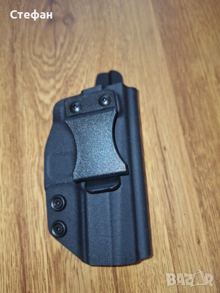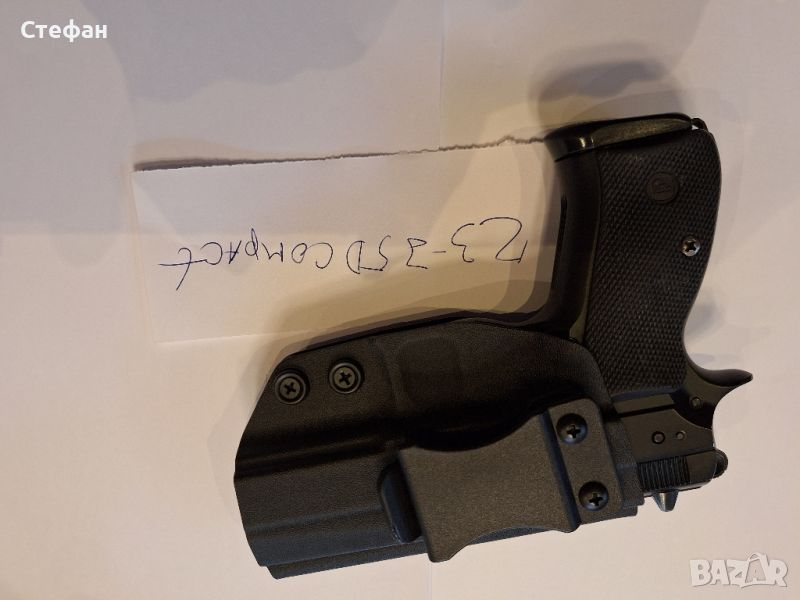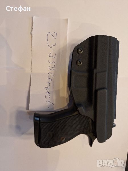 Подходящ за ЧЗ Р-07, за вътрешно скрито носене, изработен от Кайдекс Kydex. Чрез долните винтовете може да се регулира усилието за вадене, а чрез винтовете на щипката ъгълът за изнасяне. ЧЗ-то Р-07 си ляга абсолютно нормално и го покрива целия. Става също и за Р10, но кайдекса не достига до горната му част, остава непокрит със 1-1,5см., иначе си пасва без проблем. /на 7 и 8-а снимки е ЧЗ-Р10/ На последните две снимки е 75-D Compact.