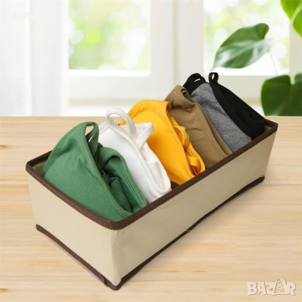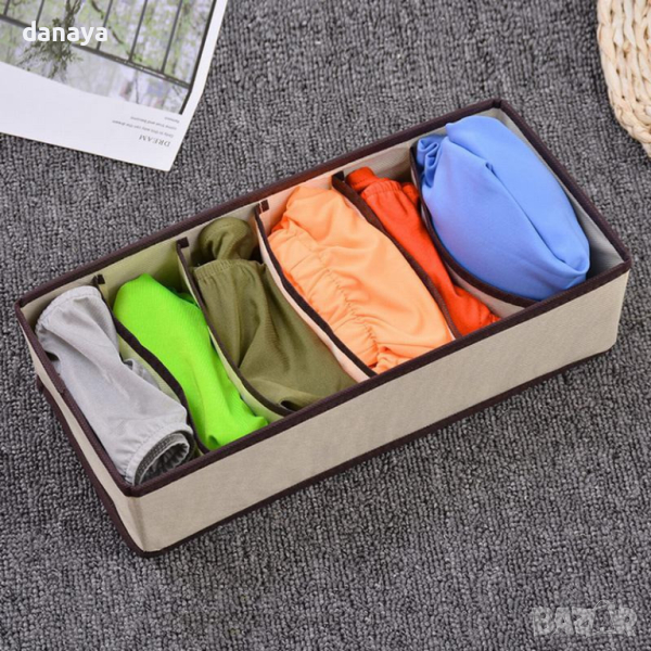 Сгъваем органайзер за чекмеджета с 6 отделения за сутиени, чорапи, връзки, колани, бельо. Сгъваем органайзер за гардероб или шкаф с 6 отделения. Сгъваем текстилен органайзер за чорапи, бельо и др. дребни аксесоари, който ще внесе ред по гардеробите и шкафовете. Практичен и удобен, сглобява се лесно и спестява куп място. Ако не го ползвате, просто сгънете и приберете. Изработен от нетъкан текстил за защита от влага и мухъл и същевременно позволява на въздуха да циркулира свободно между дрехите.