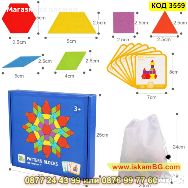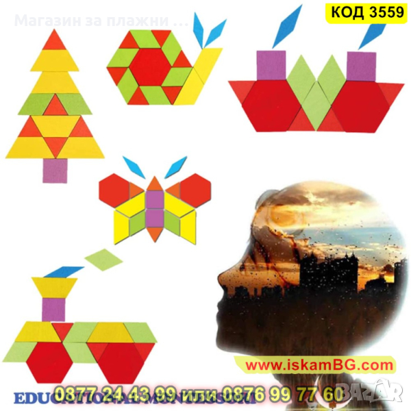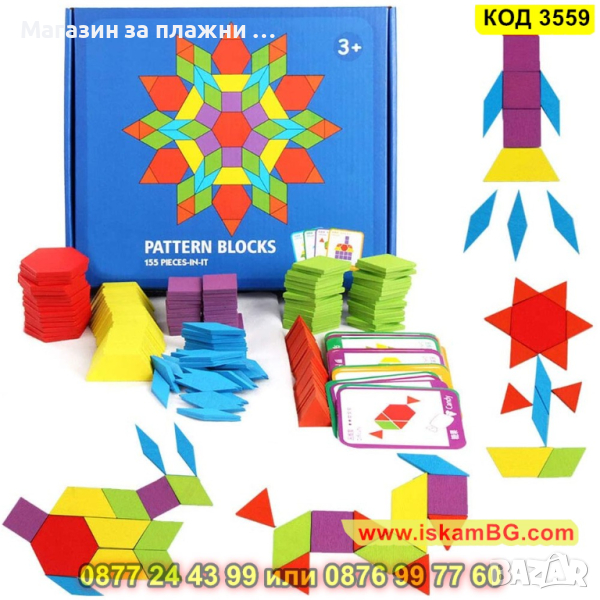 С помощта на 155 дървени цветни геометрични фигури ( триъгълник, квадрат, ромб, шестоъгълник, трапец) и набор от 24 цветни шаблони с различно ниво на трудност. Вашето дете ще има безкрайни начини за игра. То ще може да подрежда фигурките от шаблоните, да създава нови красиви модели, да сортира по цвят и форма елементите, да се научи да брои и смята. За по-големите е чудесно средство за запознаване с геометричните фигури. В конструктивна игра детето ще може да преобразува геометрични фигури. Например: 2 триъгълника образуват успоредник, 2 квадрата – правоъгълник, триъгълник и квадрат могат да направят трапец и тн.