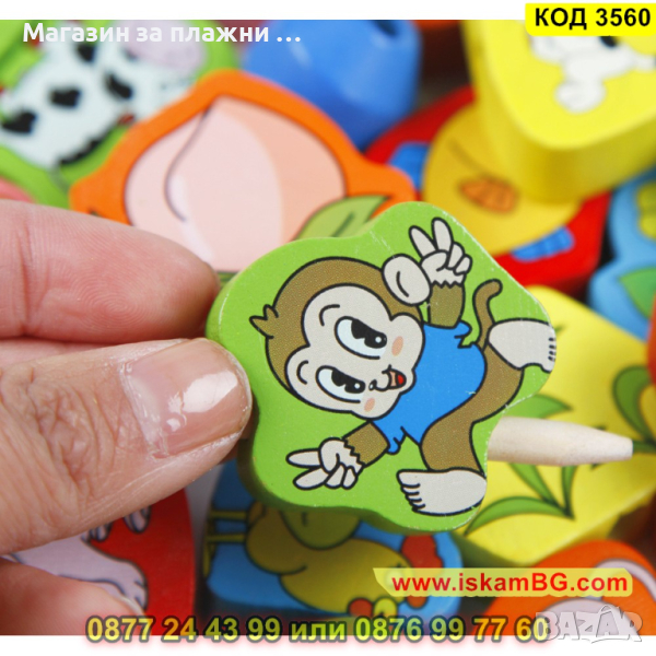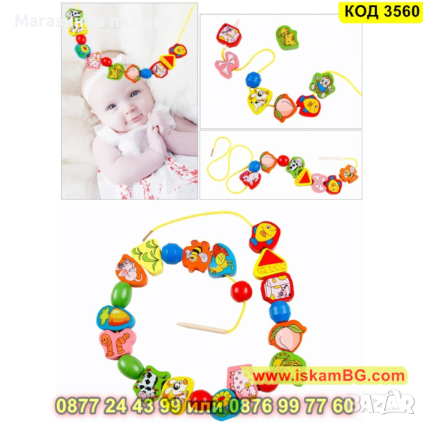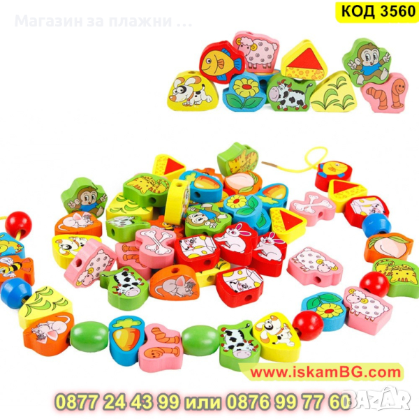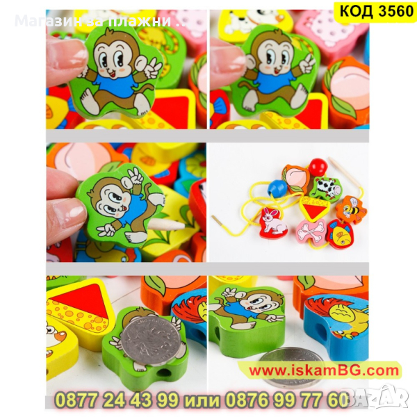 Уникална дъррвена Монтесори игра за нанизване. Съдържа 63 елемента за нанизване и 2 бр връв за нанизване. Елементите са с животни, хранителни продукти, растения и други. Идеална игра за развитие на фината моторика.