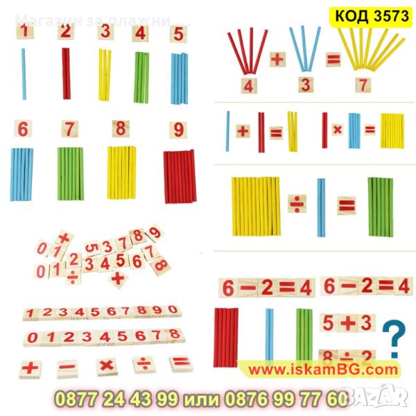 То може да смята с дървените плочки ,които представляват от 0 до 9 (х2пъти) както и 5 математически знака