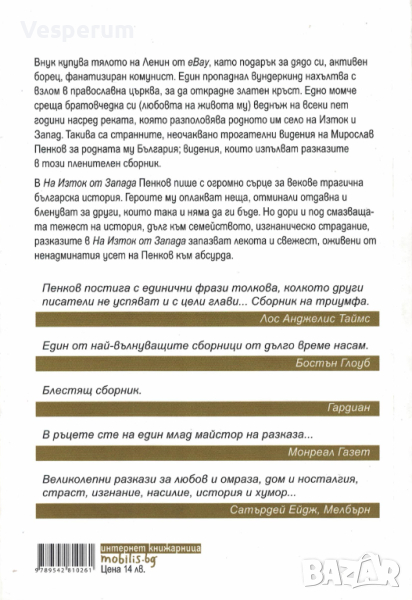 Внук купува тялото на Ленин от eBay, като подарък за дядо си, активен борец, фанатизиран комунист. Един пропаднал вундеркинд нахълтва с взлом в православна църква, за да открадне златен кръст. Едно момче среща братовчедка си /любовта на живота му/ веднъж на всеки пет години насред реката, която разполовява родното им село на Изток и Запад. Такива са странните, неочаквано трогателни видения на Мирослав Пенков за родната му България; видения, които изпълват разказите в този пленителен сборник.