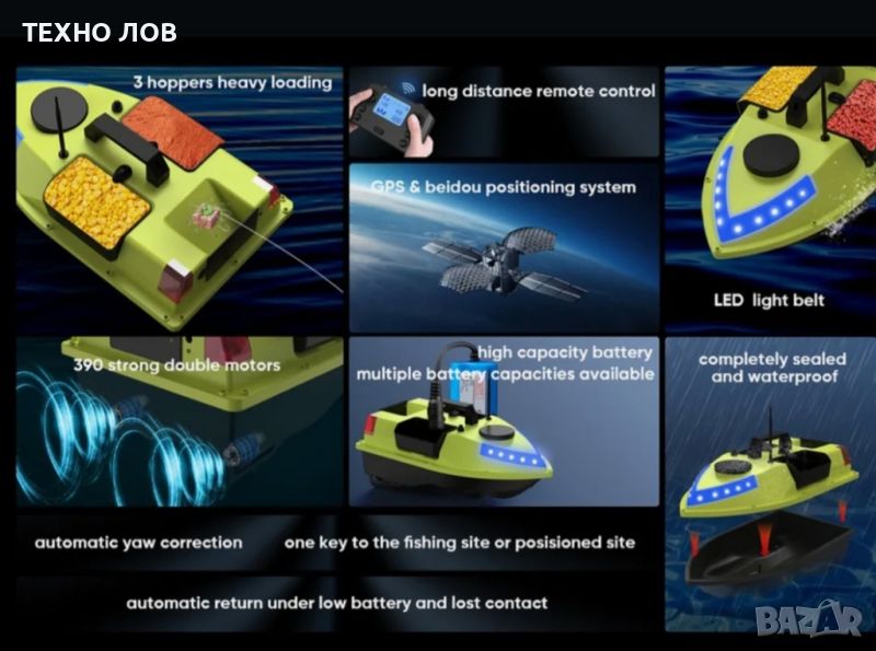 Автоматично връщане при недостиг на батерия: Когато дистанционното управление е с изтощена батерия, батерията на лодката е недостатъчна, или сигналът е загубен, лодката автоматично ще се върне към началната точка.