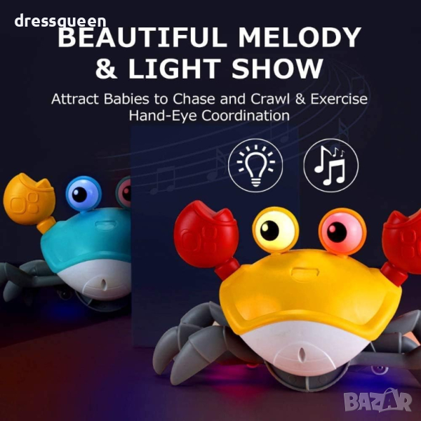 Бебешката играчка ходещ рак ще започне да пълзи с весели песни, когато срещне препятствие, докато се движи, ще започне да се движи в обратната посока, бебетата обичат да го гонят или пълзят след него. Също така може да насърчи бебетата да седят или да останат в седнало положение за дълго време, за да си играят и да го изследват. Тя има вградена музикална функция, която ще забавлява детето ви и ще го зарежда с енергия. Освен това, LED светлините ще осветят стаята и ще превърнат играта в едно незабравимо преживяване.